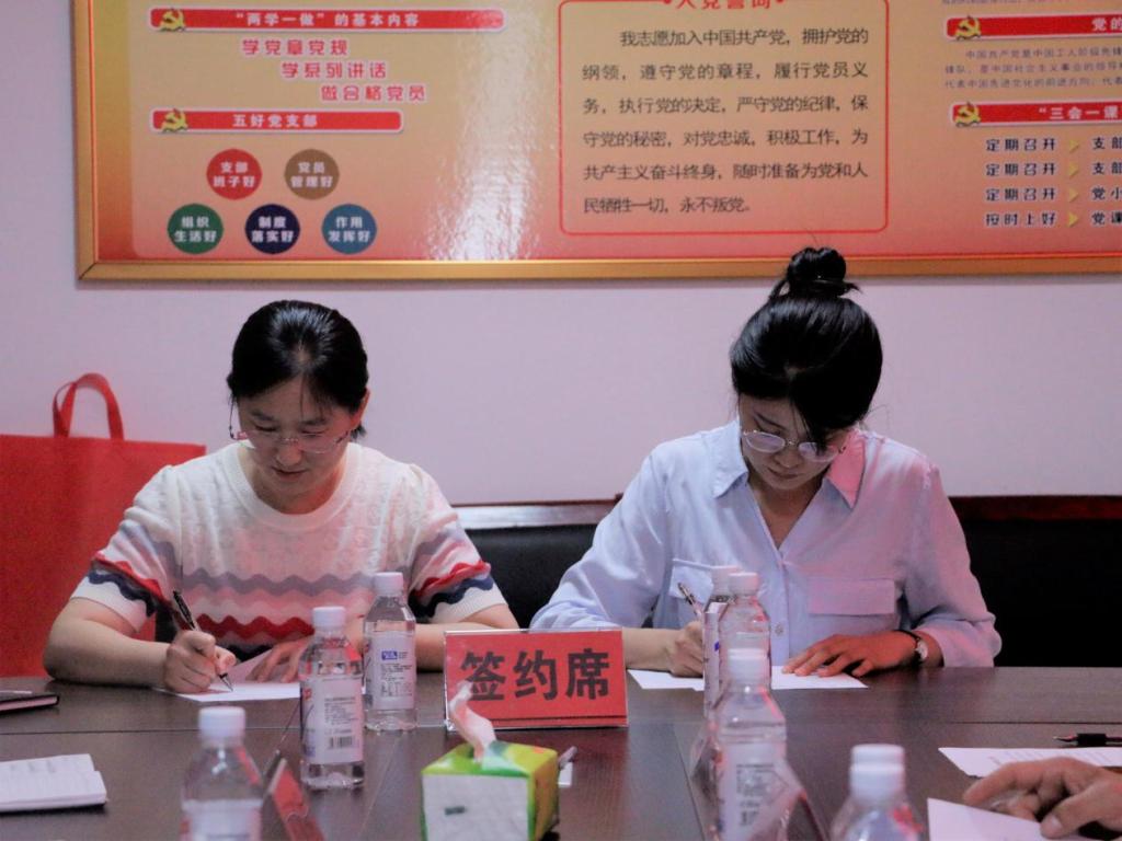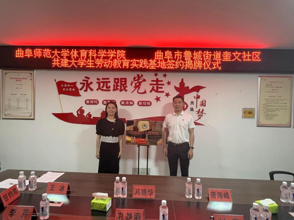 2022级辅导员王冰与奎文社区党委书记孔艳丽签订劳动教育实践基地协议书,体育学部党委副书记马振华与鲁城街道人大工作委员会副主任刘薇共同为劳动教育实践基地揭牌。