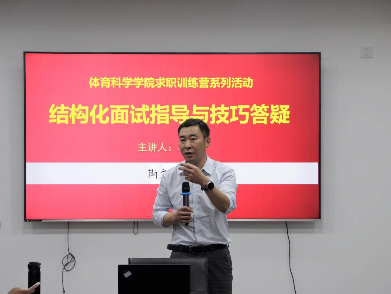 于教学楼会议室举办毕业生面试技巧专题培训。本次培训由体育学部党委副书记马振华主讲、2019级辅导员唐海峰主持。