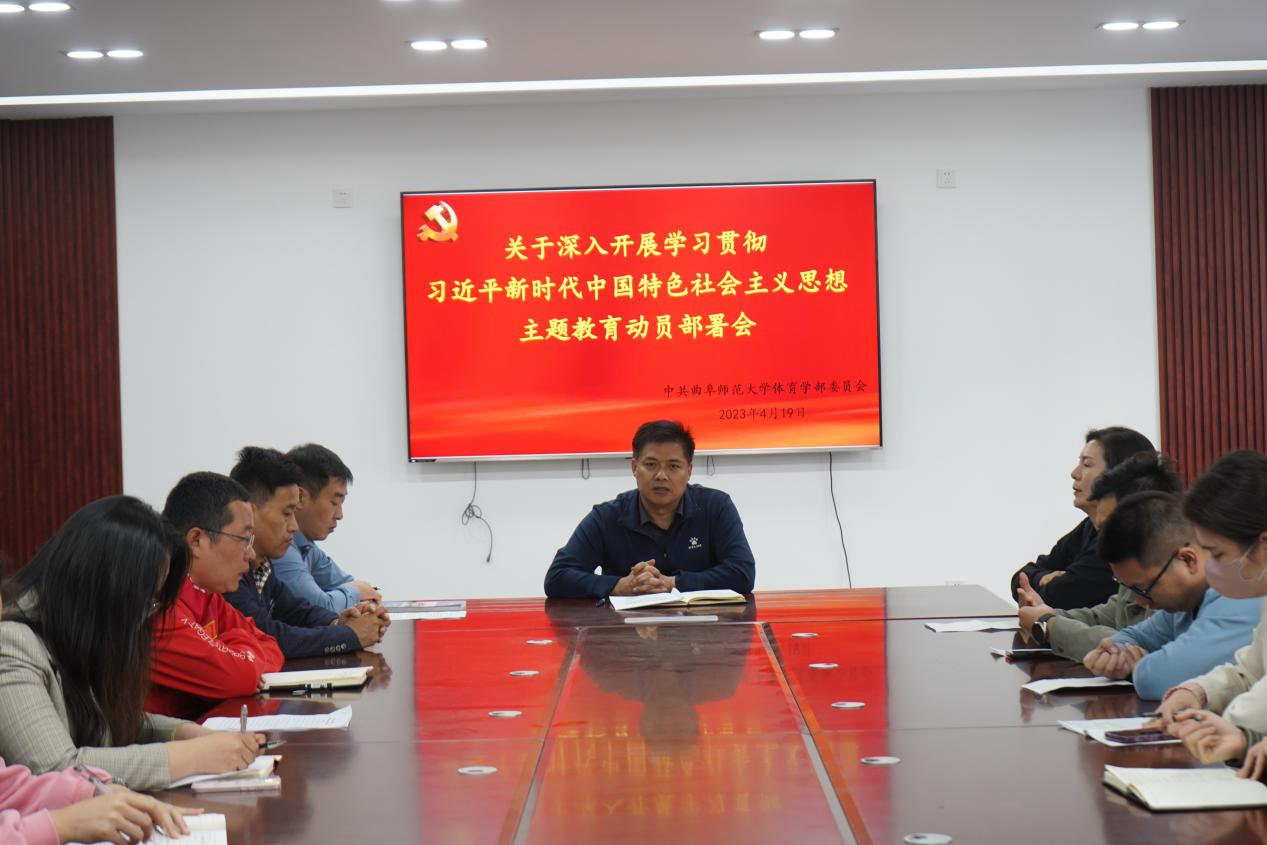 (通讯员:周晗、唐海峰 摄影:谭振浩、孙天然)为深入学习贯彻习近平新时代中国特色社会主义思想,按照中央决策部署和省委、学校相关工作安排,2023年4月19日,体育学部召开关于深入开展学习贯彻习近平新时代中国特色社会主义思想主题教育动员部署会。体育学部领导班子成员、各党支部书记及支委会委员参加会议,会议由体育学部党委副书记马振华主持。