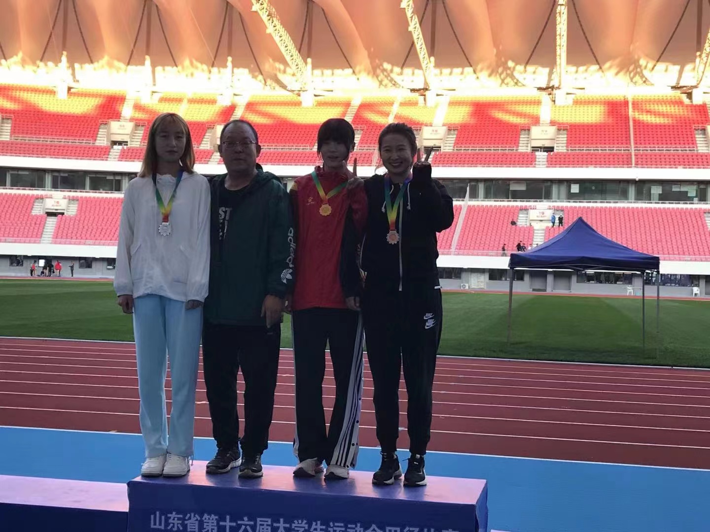 赛场上商园园同学战胜众位强手一举夺得女子七项全能冠军;卫静茹带伤坚持比赛,拼得一块女子七项全能银牌;王天泽更是发挥出超一级的水平以16.36的成绩取得银牌,并打破校男子铅球纪录;温广焱以51.87米超过一级运动员标准两米多的成绩夺得亚军;由黄柱、聂骏阳、秦凯先、张晓浩组成的男子4X100米接力队齐心协力,不畏强手,打破了去年刚刚创造的校级最高成绩,勇夺一枚宝贵的银牌。另有其他队员也取得了第四至第八名不错的成绩。当然每位成功者的背后,除了个人的不懈努力,数日的艰辛锻炼,更不可缺少的是每位教练员的专业指导。队员及教练员牺牲暑假、中秋节和国庆节等节假日休息时间,持之以恒,刻苦训练,积极参赛,才取得了山东省大运会田径项目成绩的历史性突破。