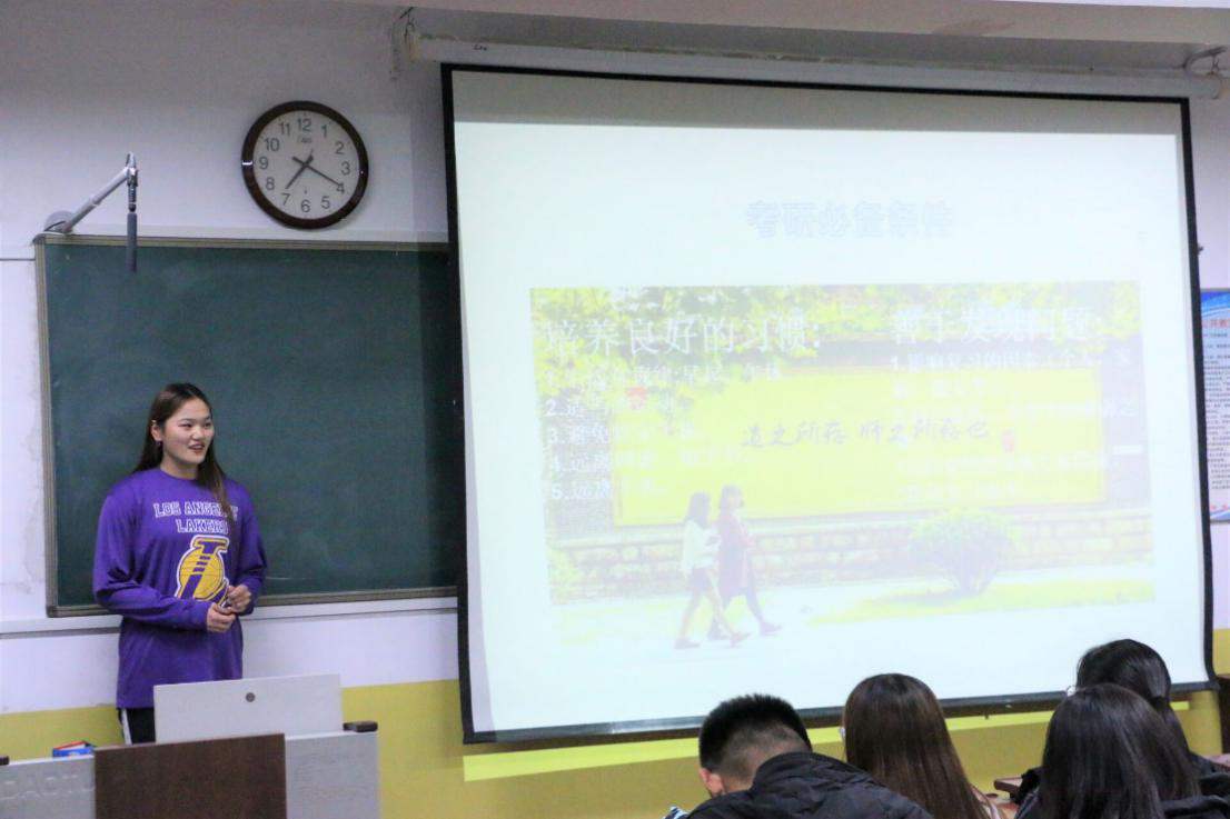 接着,李欣彤同学介绍如何结合自身条件进行备考,她主要介绍了考研应必备的条件,强调自律才能养成良好的习惯,每天都要安排好自己的学习计划,同时要注意休息,进行适量运动等等,对复习中应该注意的一些问题给大家做了一些相关的普及。