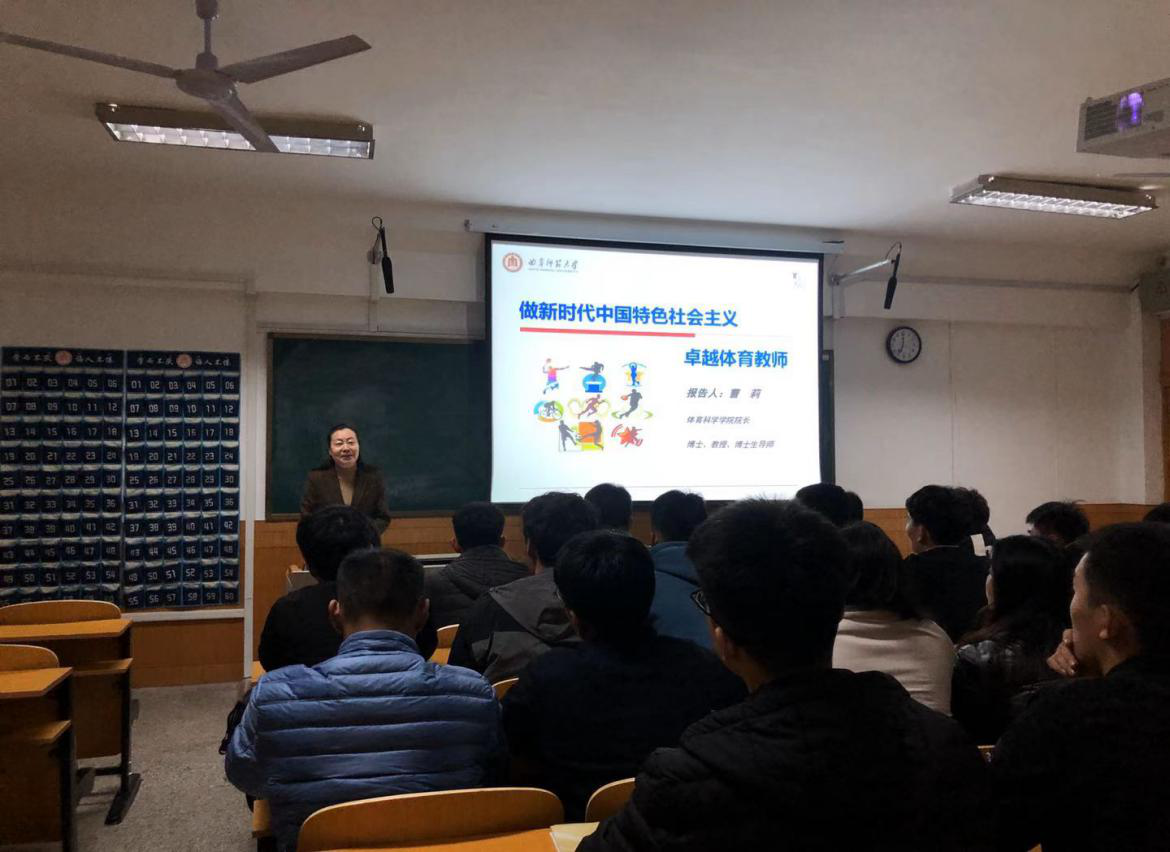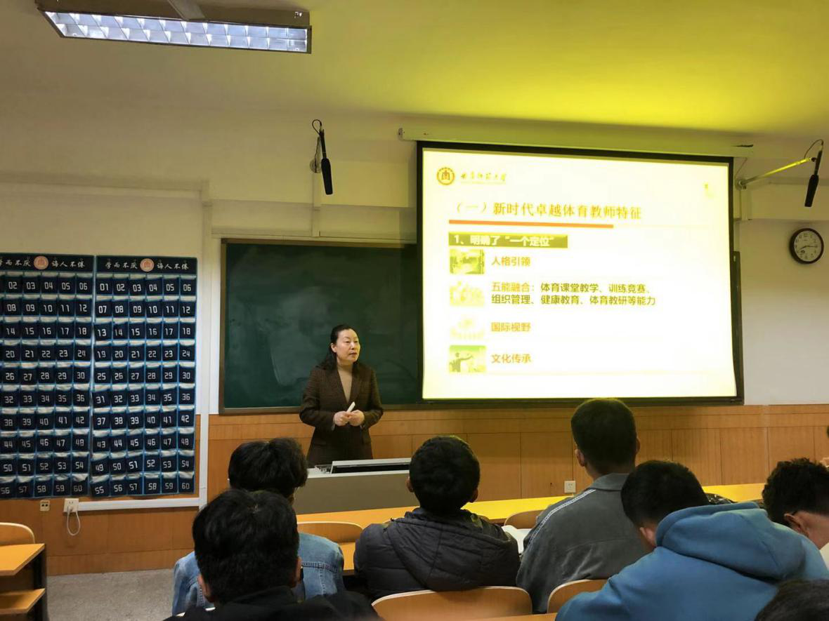 曹莉院长以“做新时代中国特色社会主义卓越体育教师”为课堂主题,向学生讲授如何才能做好卓越的体育教师。