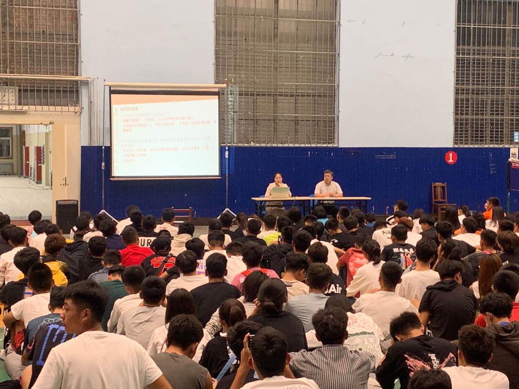 于院篮球馆召开教务选课指导会,由副院长李思民与教务员滕云玲为2020级新生进行选课指导。