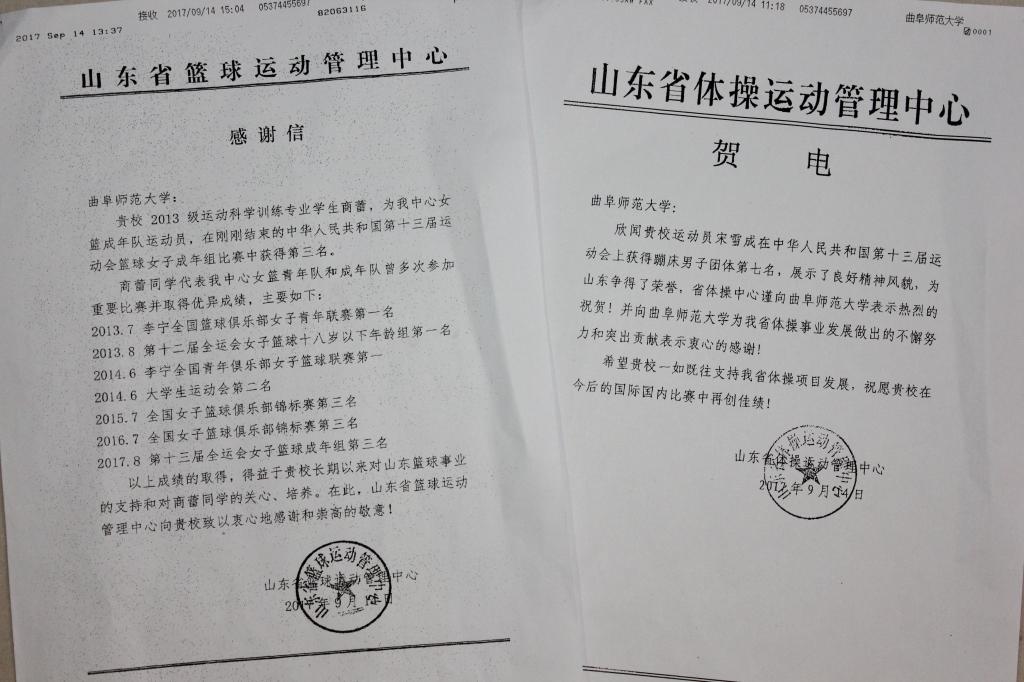 山东省篮球运动管理中心、山东省体操运动管理中心等发来贺电,祝贺我院学子在全运会多个项目上取得的骄人成绩,感谢bet365