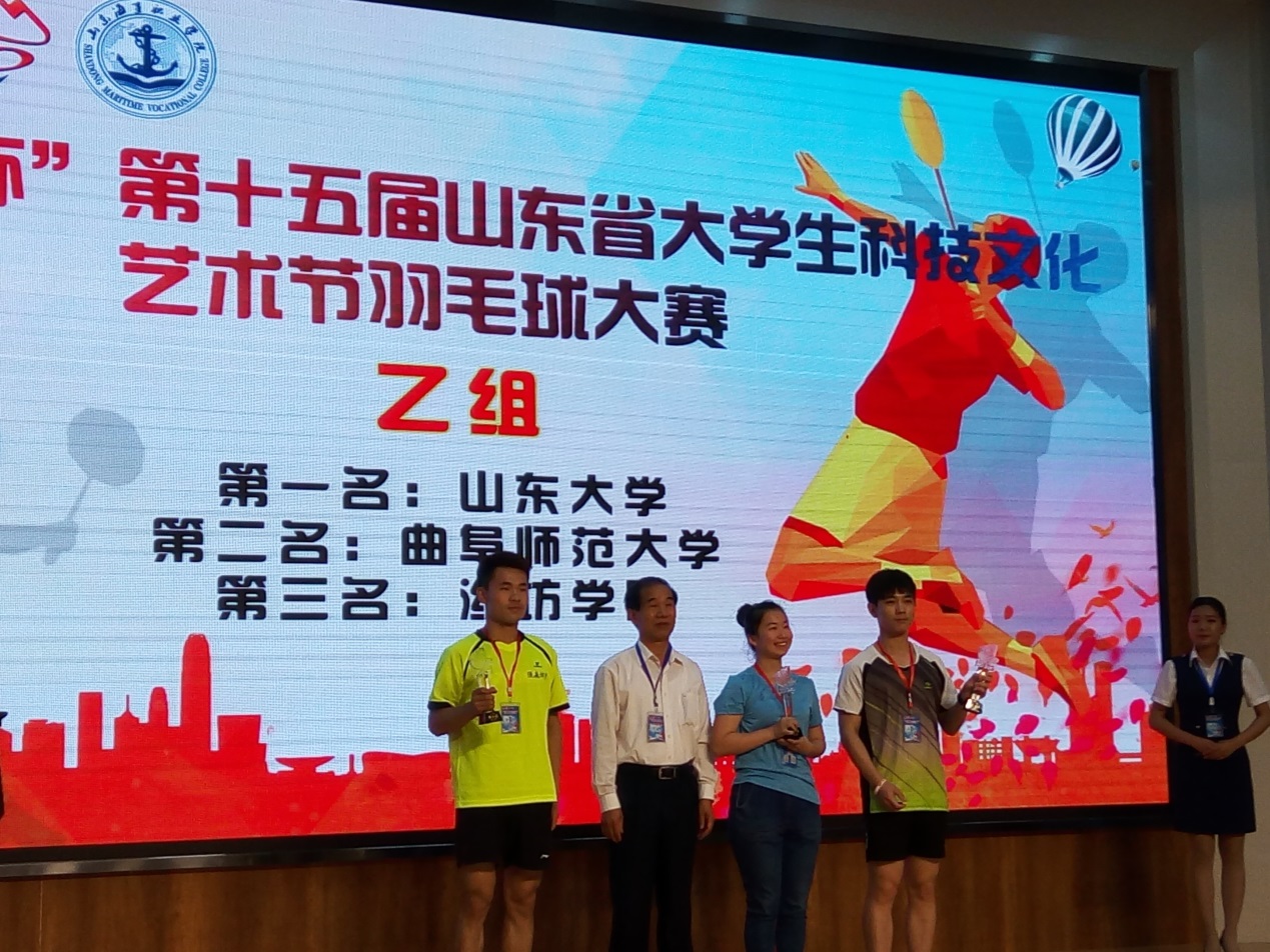 2017年6月10日至12日,“山海院杯”第十五届山东省大学生科技文化艺术节羽毛球大赛在山东海事职业学院拉开帷幕,此次比赛包括山东大学、中国海洋大学、山东科技大学等16所高校参加,我院也派出队伍参加比赛,经过三天激烈的角逐,bet365 代表队荣获乙组团体亚军的好成绩,廖志强老师获得优秀教练员称号。