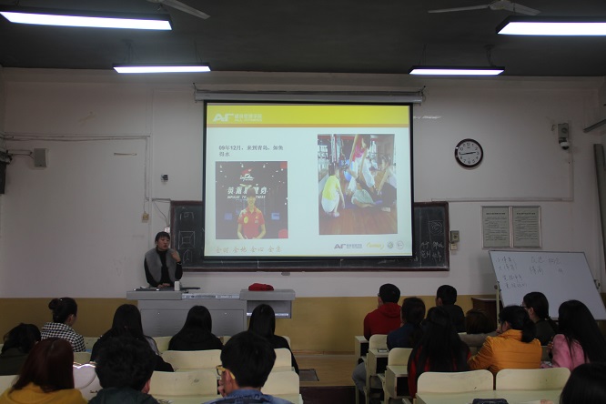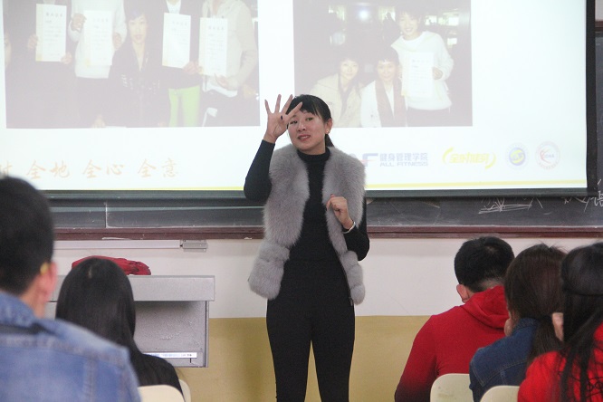 于院楼209教室举行体育产业(健身行业)创业论坛讲座,本次讲座邀请的是ALLFIT健身管理学院校长王芳琳老师,我院全体学生干部及部分同学参加了本次讲座。