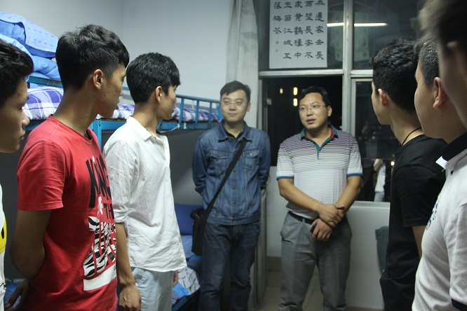党总支副书记展利民,办公室主任王丽,团总支书记赵峰,辅导员梁贺涵带领学生会主要成员深入学生宿舍慰问学院2015级新同学。