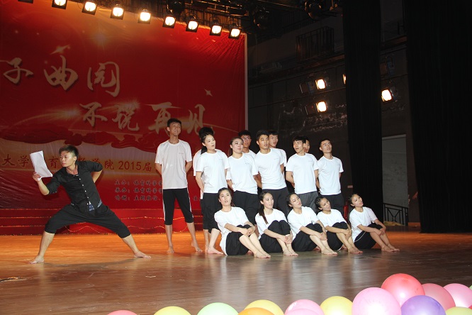 于大学生活动中心礼堂隆重举办2015届舞蹈学专业汇演。出席本次晚会的有学院党总支副书记展利民,团总支书记赵峰,体操教研室王月敏老师、齐光辉老师和郑亚淼老师,学生辅导员李娜,2015届毕业生及学院部分学生。