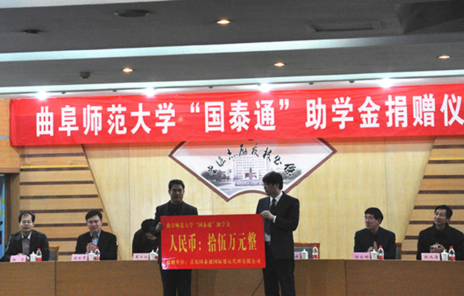 “国泰通”助学金捐赠仪式在我校孔子会堂隆重举行。出席捐赠仪式的有校友孙国成,学校副校长扈庆学,学校办公室主任夏云杰,学校学生工作处处长杨永明,学校团委书记屈跃宽,学校招生就业处副处长杨东,我院党总支书记荆兆清,副书记展利民,团总支书记赵峰,辅导员李娜。本次会议由学校办公室主任夏云杰主持,副校长扈庆学、青岛国泰通国际货运代理有限公司董事长、bet365