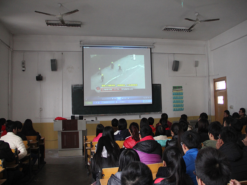 在学院202教室组织学生观看安全教育宣传片。宣传片引用近几年国内外四所大学学生宿舍的火灾案列,向同学们揭示了宿舍火灾的严重性和危害性,同时科学系统地介绍了宿舍火灾的起因、过程及面对火灾的自救方法。