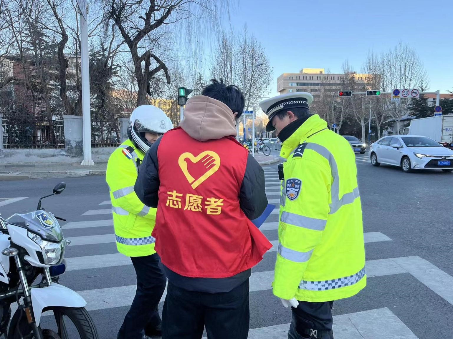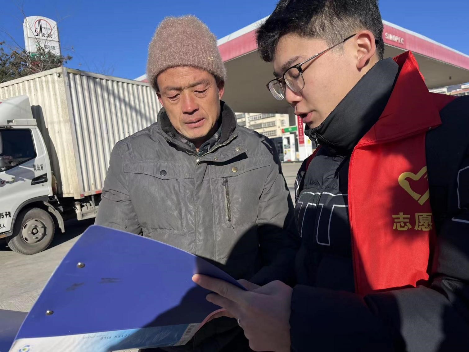 图片为实践队员向交警介绍队伍调查问卷。王皓 供图