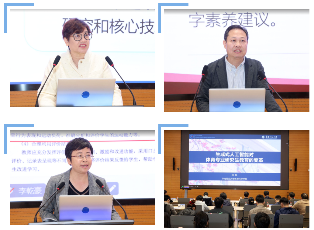 段锐教授分别作“数据驱动的健康生活方式研究”“数字时代高校体育专业教师数字素养的价值意蕴、现实挑战及提升路径”“新课标背景下智能体育教学实践探索”和“生成式人工智能对体育专业研究生教育的变革”的主旨报告。四位专家从运动健康促进、体育学科建设、体育课程改革、研究生培养等角度强调了数智赋能的理论与实践价值。