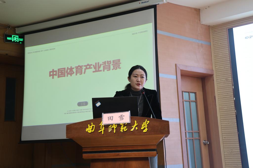 随后,田雪以“中国体育产业背景”为主题,展开了深入的报告。会中,田雪结合马斯洛需求理论,对中国体育产业的驱动力、规模、结构进行了全方位的分析,并进一步探讨了体育产业市场的多个方面。她特别提到了同学们普遍关心的创新创业问题,针对运动装备、体育场地、体育赛事运营等赛道进行了详细分析,就同学们的疑问进行了耐心解答。