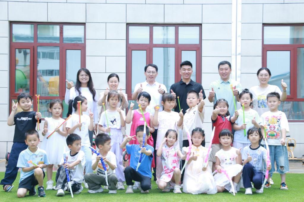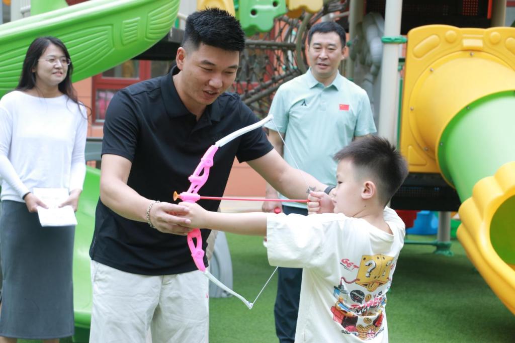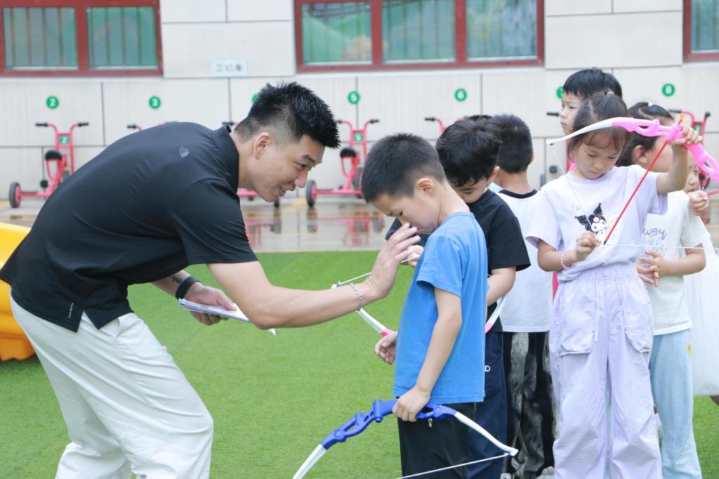 戴小祥一亮相就受到孩子们的热烈欢迎,他亲切地向幼儿代表们示范基础射箭姿势,从握弓手势到瞄准技巧,每一个动作都讲解得通俗易懂。"注意手肘要抬平,就像托起一个小水盆",他用形象的比喻帮助孩子们理解专业动作要领。在互动体验环节,孩子们轮流尝试搭箭、拉弓,戴小祥则手把手指导,温柔的话语和专业的示范让整个活动充满趣味与温情。