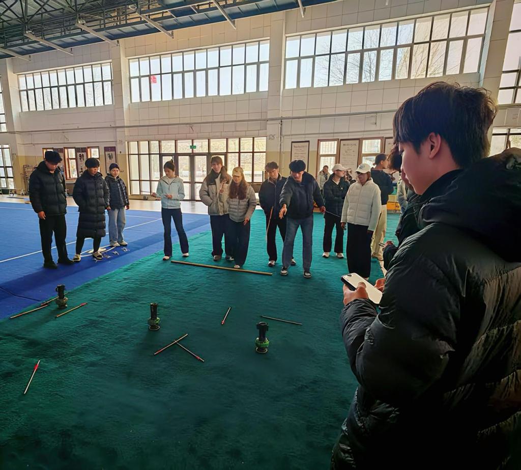 两米开外,铜壶静立,赛场光影雅致。志愿者耐心讲解投壶礼仪与技巧,手把手指导同学们站姿与握箭角度。选手凝神专注,动作利落干脆,竹箭或精准入壶,或擦边而过,每一次投掷都尽显沉稳与巧思。赛场动静相宜,屏息与喝彩交织,尽显传统雅艺之趣与精准之美。