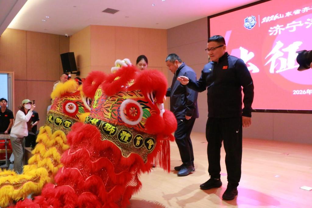 在点睛环节,姜付高与张雷受邀共同上台为雄狮点睛,一笔一画饱含美好期许,寓意球队鸿运当头、旗开得胜,在赛场上奋勇争先、再创佳绩。紧接着,队旗庄严入场,旗帜飘扬尽显球队斗志,象征着使命与责任的传递。随后,卢静向球队授予出征战旗。授旗礼成,全场激情涌动,队员们深受鼓舞,斗志昂扬。球队代表带领全体队员庄严宣誓,誓言铮铮,初心如磐,展现了全力以赴、捍卫荣誉的坚定决心。