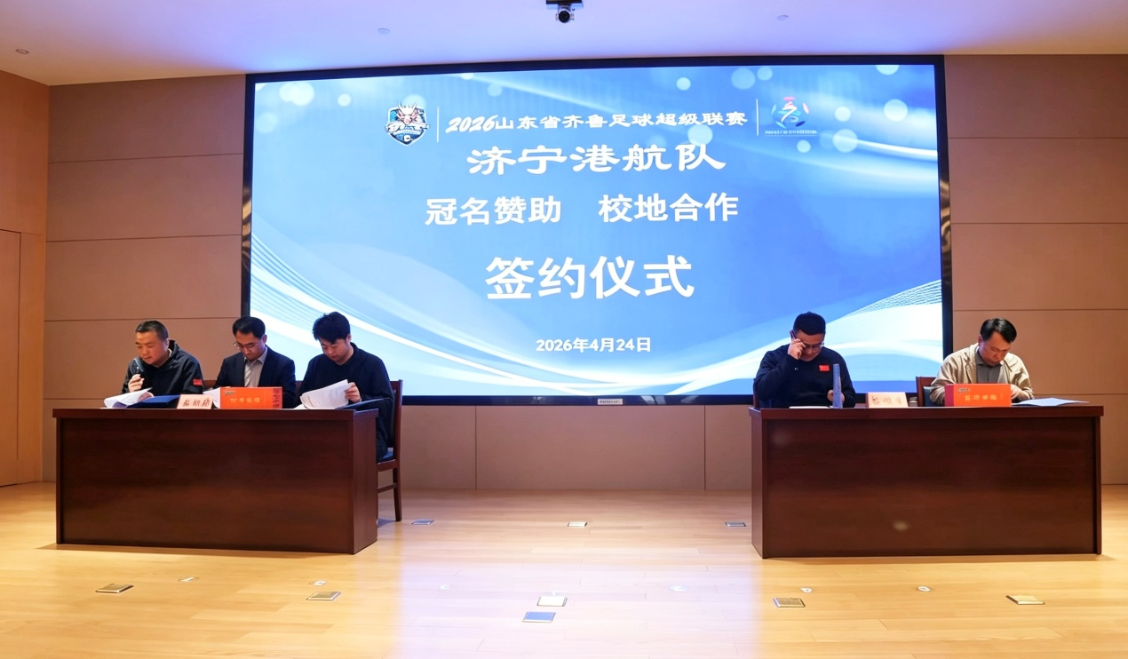 与山东融汇集团、济宁国投等单位正式举行冠名赞助与校地合作签约仪式,张雷与楚遵杰代表双方签署冠名权益协议;许怀祥、孙延斌与王鸿飞共同签署校地合作协议。双方达成体育合作共识,携手搭建校园体育与地方体育协同发展的全新平台,为地方足球事业发展筑牢合作根基。