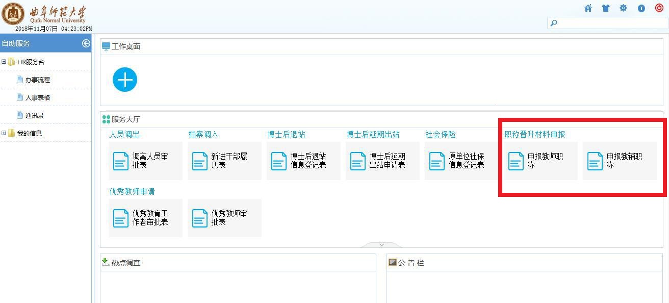 2.报名:11月26日-12月2日,拟参评人员通过人力资源系统网上报名,方式为:登录学校主页“信息门户”—“人事系统”—“服务大厅”—“职称晋升材料申报”— 选择“申报教师职称”或“申报教辅职称”进入。如下图: