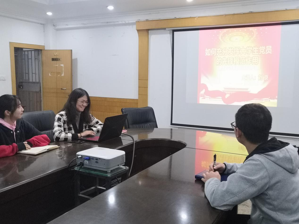 11月9日上午,本科生党支部书记刘京在学院一楼会议室为本科生党支部党员及入党积极分子上了一堂党课,主题是“如何充分发挥大学生党员的先锋模范作用”。