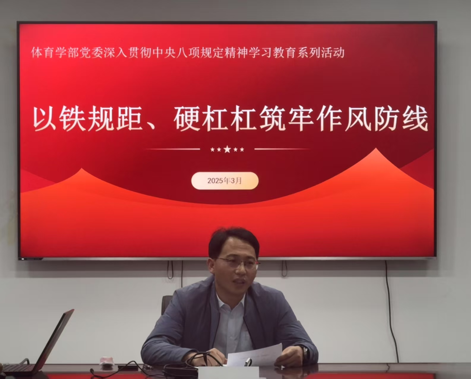 在会议的最后环节,许怀祥以“以铁规矩、硬杠杠筑牢作风防线”为题,为在座党员干部上了一堂生动且深刻的党课。许书记结合体育学部工作实际,深入剖析了中央八项规定精神的内涵和实质,并通过列举真实案例,对违反中央八项规定精神的行为进行了深入浅出的解读。同时,书记还对体育学部党员干部提出了具体要求,希望大家在日常工作和生活中,时刻保持清醒头脑,严守纪律底线,自觉抵制各种诱惑,以实际行动践行中央八项规定精神,共同营造风清气正的政治生态和干事创业的良好氛围。