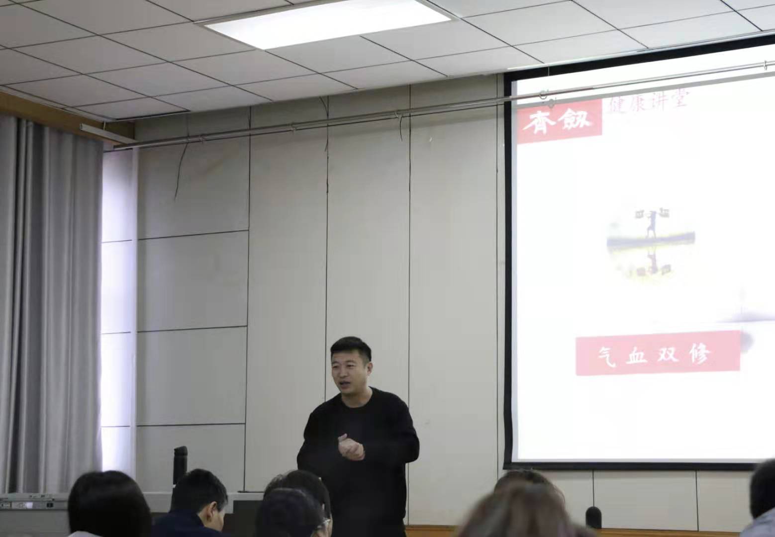 随后,刘明素先生正式展开报告,围绕“气血双修,阴阳动变,体育健康,健康体育”这几个关键词,就中医于养生的角度展开报告。在讲授的同时,对于一些方法进行演示。到场的老师同学们也积极倾听,提出相关问题,刘先生也一一回复,为老师和同学们答疑解惑。