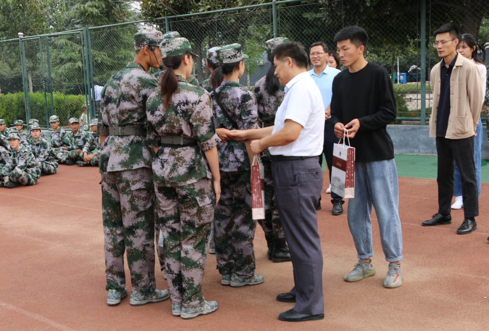 同时,刘敏书记高度肯定了教官所作出的努力和取得的成绩。对他们的辛勤付出代表学院送上礼品以示诚挚感谢。他还表示希望教官们克服困难,再接再厉,确保军训后续工作有序平稳进行。