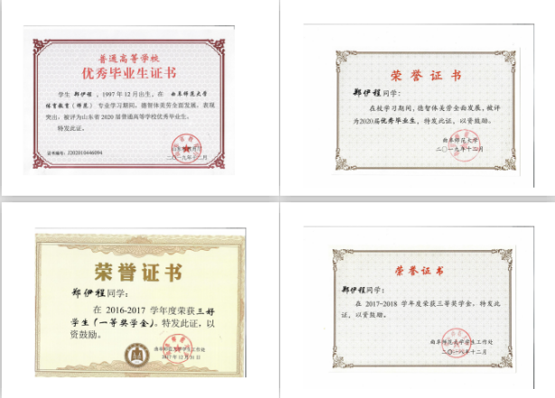 在曲师大学习的这四年中,在学习方面获得过校一等奖学金、二等奖学金、三等奖学金、优秀团员、优秀团干部、校优秀毕业生、山东省优秀毕业生;在社会实践方面参加过“三下乡-千村行动”共青团助力扶贫专项行动,我们梁山县“帮扶互助 扶贫攻坚”支教队在社会实践宣传展示活动中,获优秀队伍和bet365
