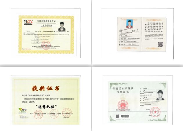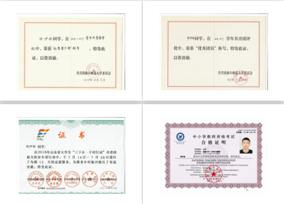 社会实践团队三等奖,还获得了2018 年央视春晚曲阜分会场演出证书、 曲阜国际圣城半程马拉松起终点裁判员证书和武状元杯优秀志愿者证书;在技能方面考取了全国计算机等级考试二级合格证书、 教师资格证-高级中学(体育与健康)、体能训练师、普通话水平测试等级证书、排球二级裁判员证和英语四级。