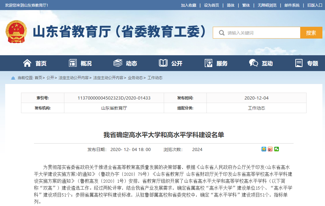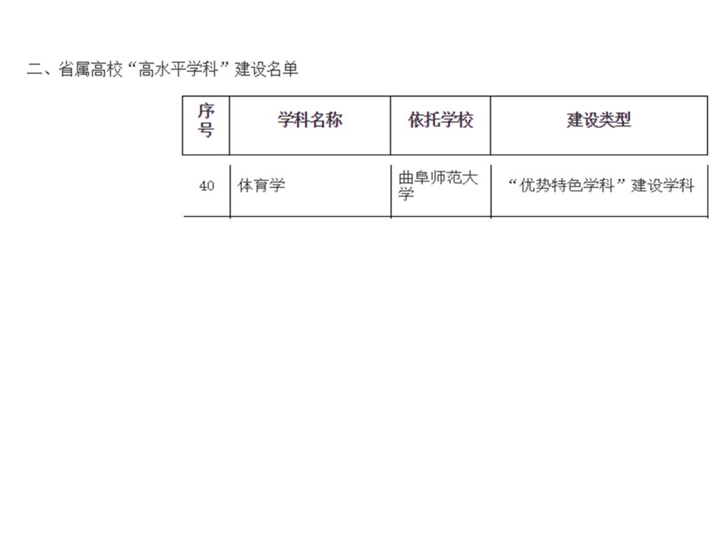 山东省高等学校高水平学科建设是省教育厅为贯彻落实省委省政府关于推进全省高等教育高质量发展的决策部署,进一步优化高校学科布局,切实提升学科综合实力和竞争力而推出的重要举措。经过两轮评审,确定了省属高校“高水平学科”建设项目51个,体育学科仅此一项。
